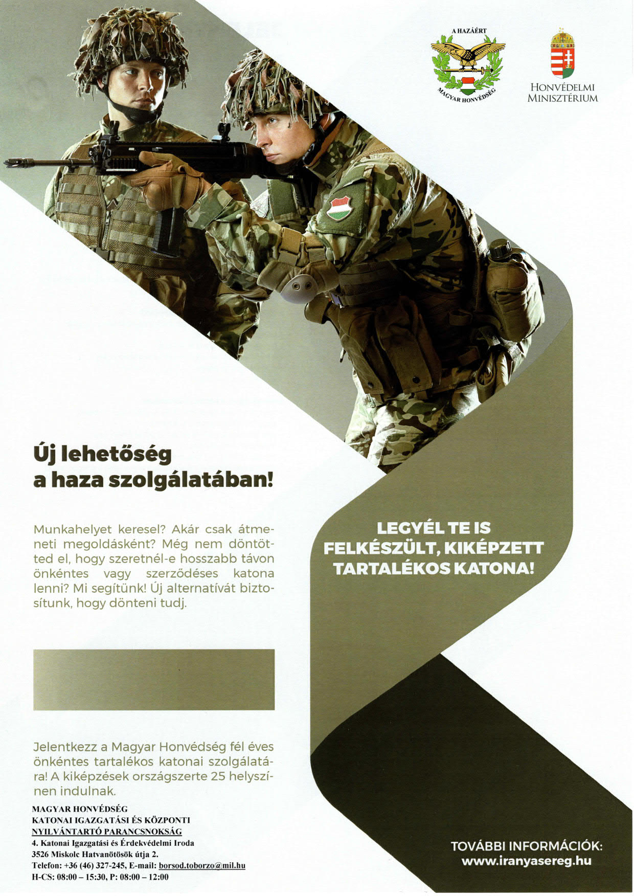 A jelentkezők dönthetnek úgy is, hogy áttérnek más tartalékos szolgálati formára, vagy pályájukat szerződéses katonaként folytatják, amennyiben megfelelnek az ehhez szükséges fizikai, pszichikai és egészségügyi feltételeknek. A Magyar Honvédség a toborzóirodáiban és az interneten is vár mindenkit, aki a haza szolgálatát választja, további információk a www. iranyasereg.hu oldalon találhatóak.