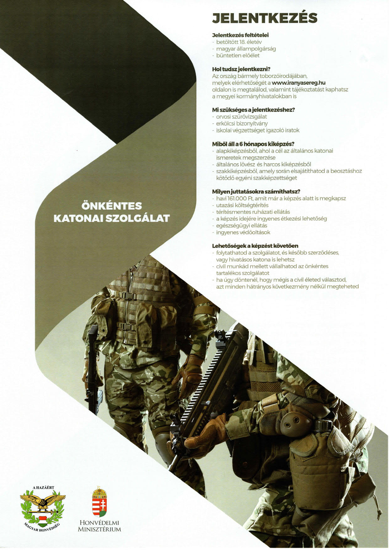 A Magyar Honvédség az ország egyik legnagyobb és legbiztosabb munkáltatója, mely a koronavírus-járvány elleni védekezésben akár több ezer fő foglalkoztatásával is szerepel vállal. A speciális tartalékosi szolgálat a munkahelyüket elveszítő, felnőtt korú, erkölcsi bizonyítvánnyal rendelkező magyar állampolgároknak szól. A honvédségnél mindenki megtalálhatja a számításait, mert a klasszikus katonai feladatok mellett, szinte valamennyi civil szakma képviselőit tudják foglalkoztatni.